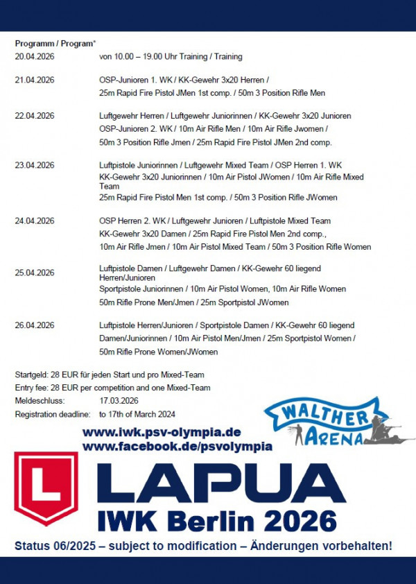 The 31st Lapua IWK Berlin in the Walther Arena is scheduled for April 20th – 26th, 2026.